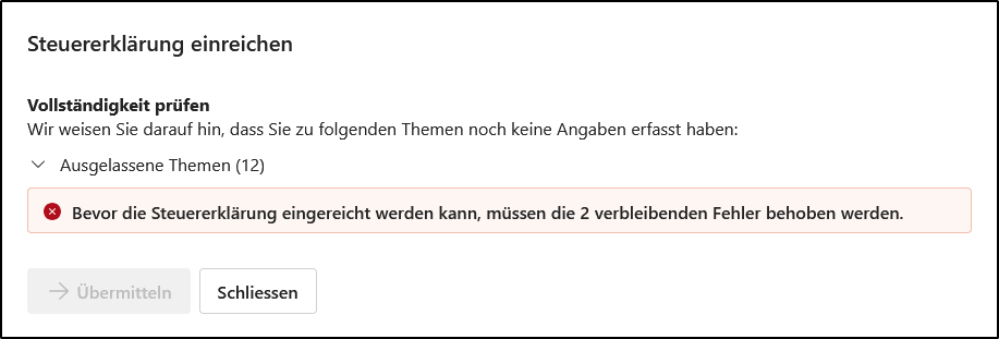 - Das Steuerprogramm eSteuern.LU führt daraufhin automatisch eine Vollständigkeitsprüfung durch. Solange noch nicht alle Fehler behoben sind, kann der Einreichungsprozess nicht fortgesetzt werden. Welche Fehler noch zu korrigieren sind, sehen Sie, indem Sie direkt auf die angezeigte Fehler klicken.
