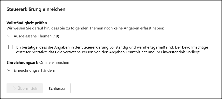 - Vollständigkeitsprüfung: Durch Aktivieren der Checkbox bestätigen Sie, dass Ihre Deklaration vollständig und wahrheitsgemäss ist. Erst nach dem Anklicken dieser Checkbox wird die Schaltfläche zur Übermittlung aktiviert, und die Steuererklärung kann eingereicht werden.