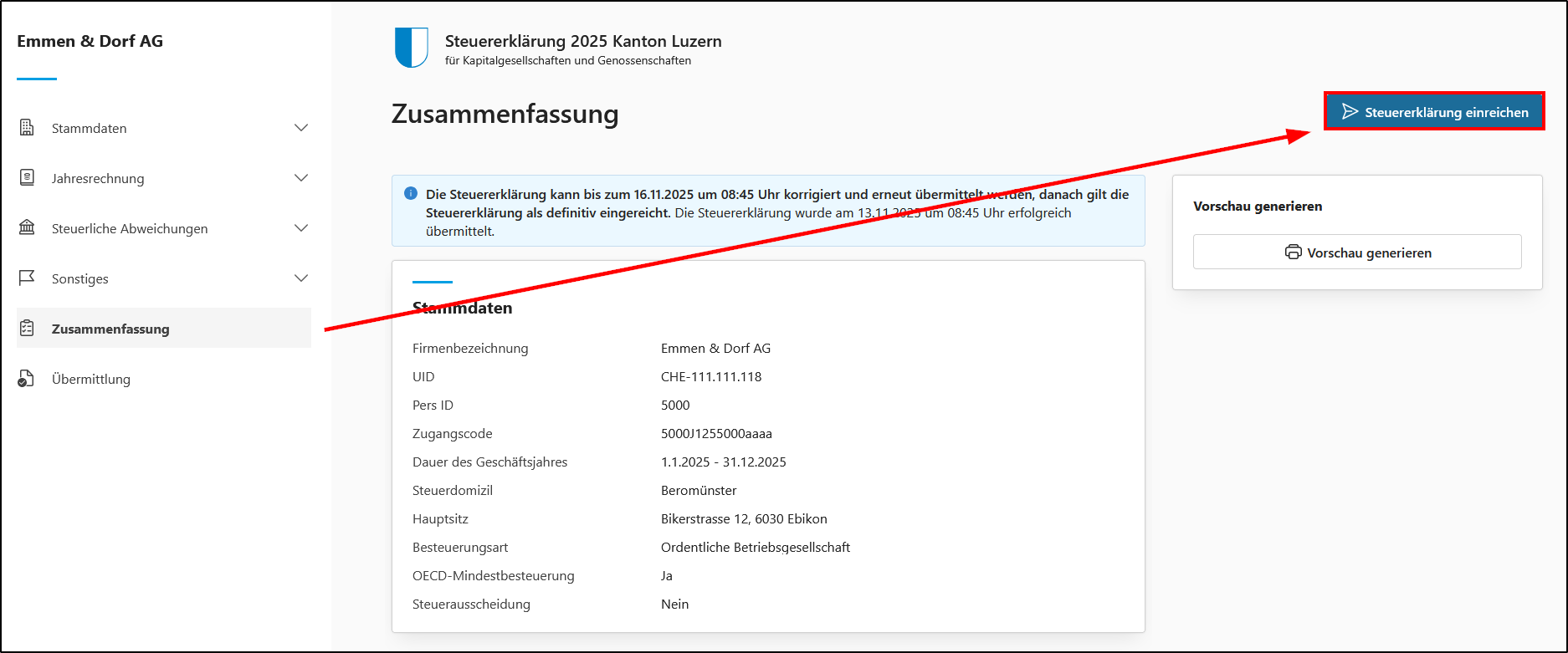 - Öffnen Sie das Register <Zusammenfassung> und klicken Sie anschliessend auf die Schaltfläche <Steuererklärung einreichen>, um den Einreichvorgang zu starten.