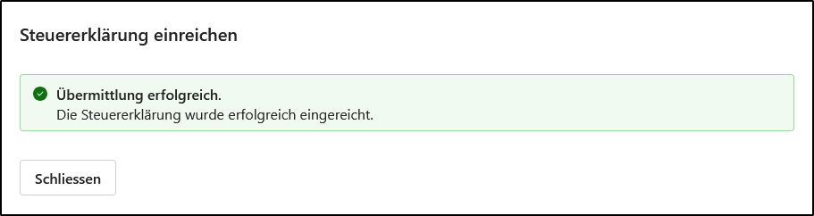 Das <Schliessen> dieses Dialogs bringt Sie automatisch zurück auf die Seite <Übermittlung>, auf der Ihre eingereichte Steuererklärung abgespeichert ist.