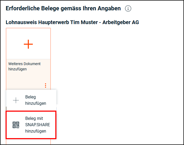 - Klicken Sie anschliessend auf <Beleg mit SNAP.SHARE hinzufügen>. Es wird ein QR-Code angezeigt.