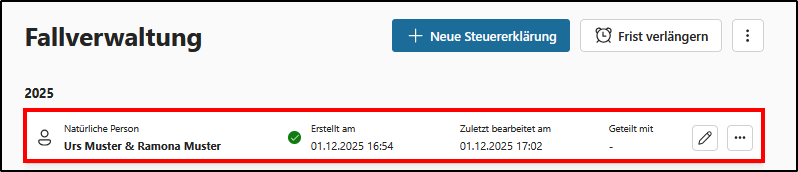 - Wählen Sie in der "Fallverwaltung" die entsprechende Steuererklärung aus.