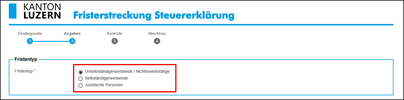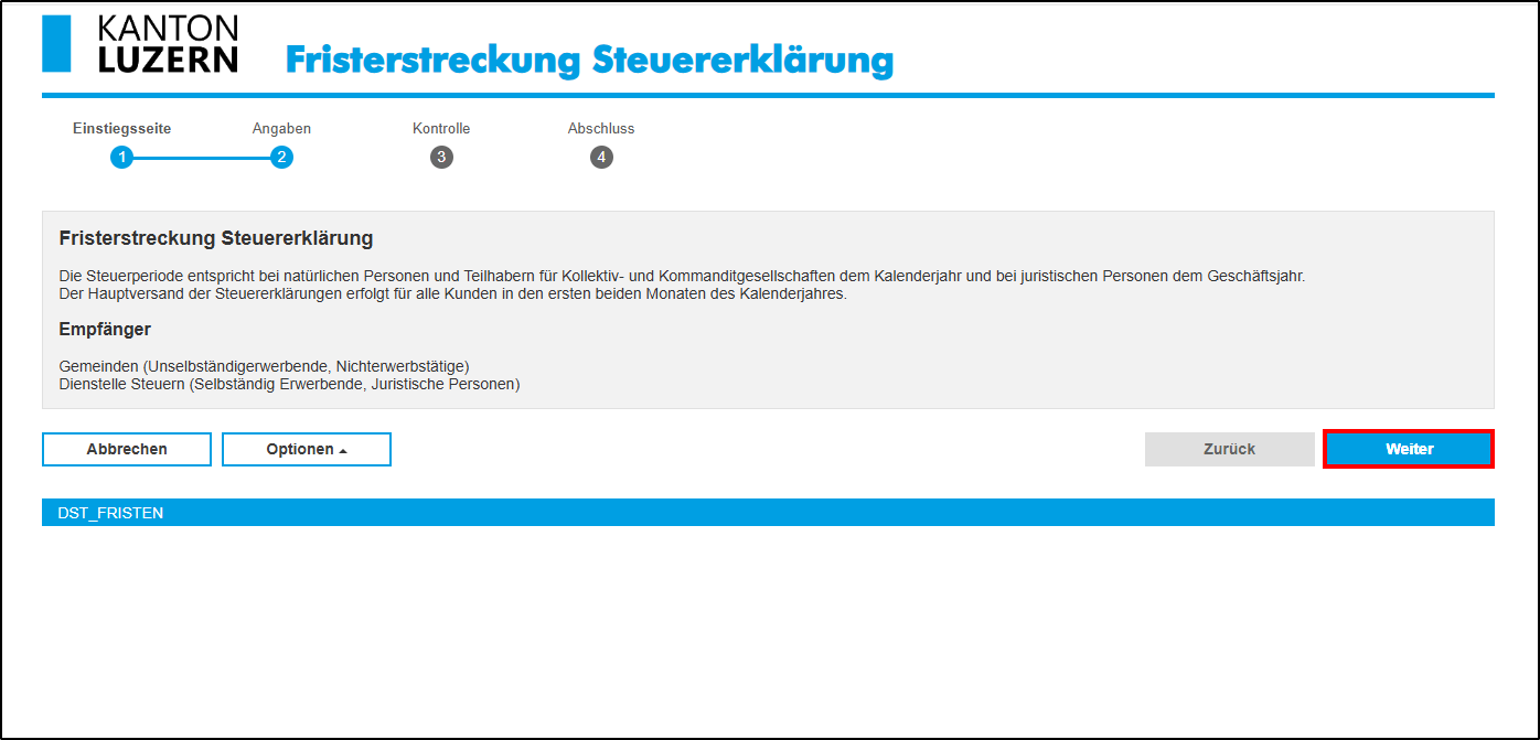 - Melden Sie sich auf eSteuern.lu.ch an und wählen Sie auf der Startseite den Button <Frist verlängern>.
