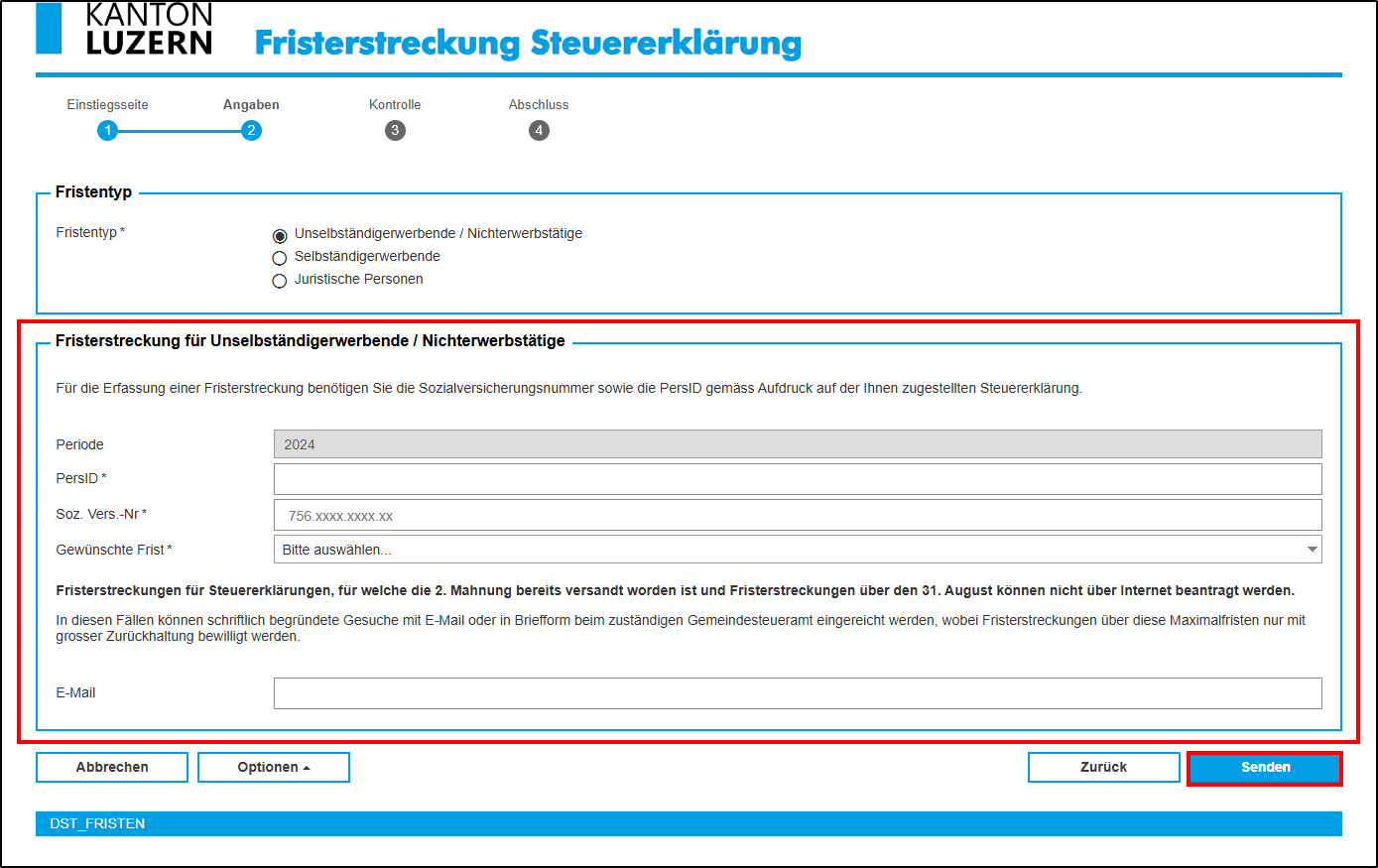 - Darunter öffnet sich das Eingabefeld für die erforderlichen Angaben zur Fristverlängerung. Klicken Sie anschliessend auf <Senden>.