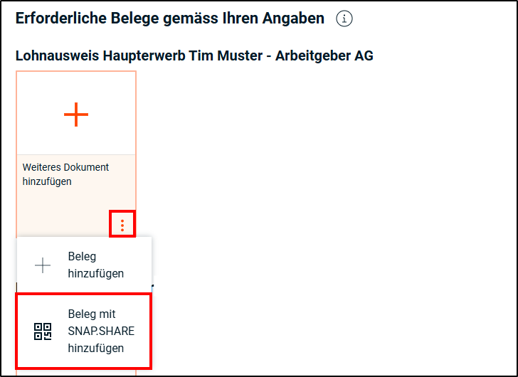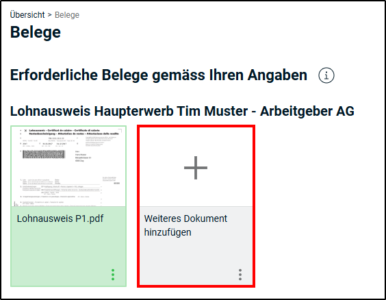 - Sobald ein Dokument im Belegfeld erscheint, öffnet sich automatisch ein zusätzliches Feld. Somit können Sie bei Bedarf weitere Belege derselben Kategorie hinzufügen.