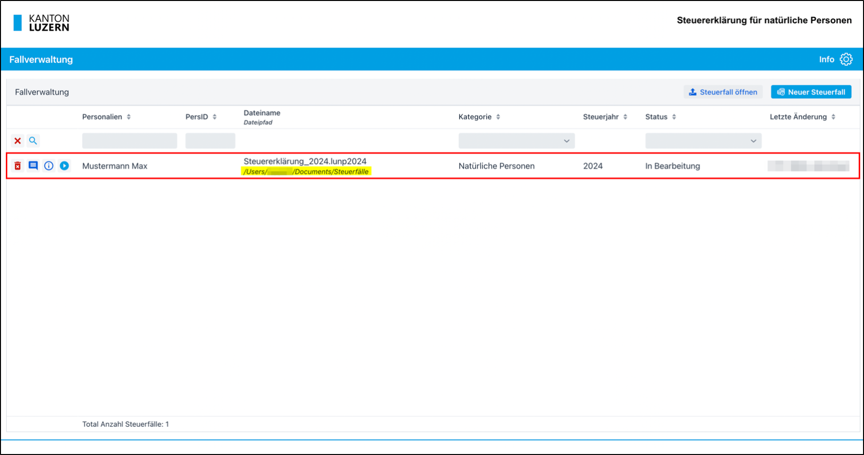 Öffnen Sie das Steuerprogramm steuern.LU.2024 und überprüfen Sie, ob Ihre Steuerdaten aus dem Jahr 2024 vollständig vorhanden sind. Unter dem Titel „Dateiname“ finden Sie zudem den Dateipfad, an dem Ihre Steuerdaten im Explorer gespeichert wurden.