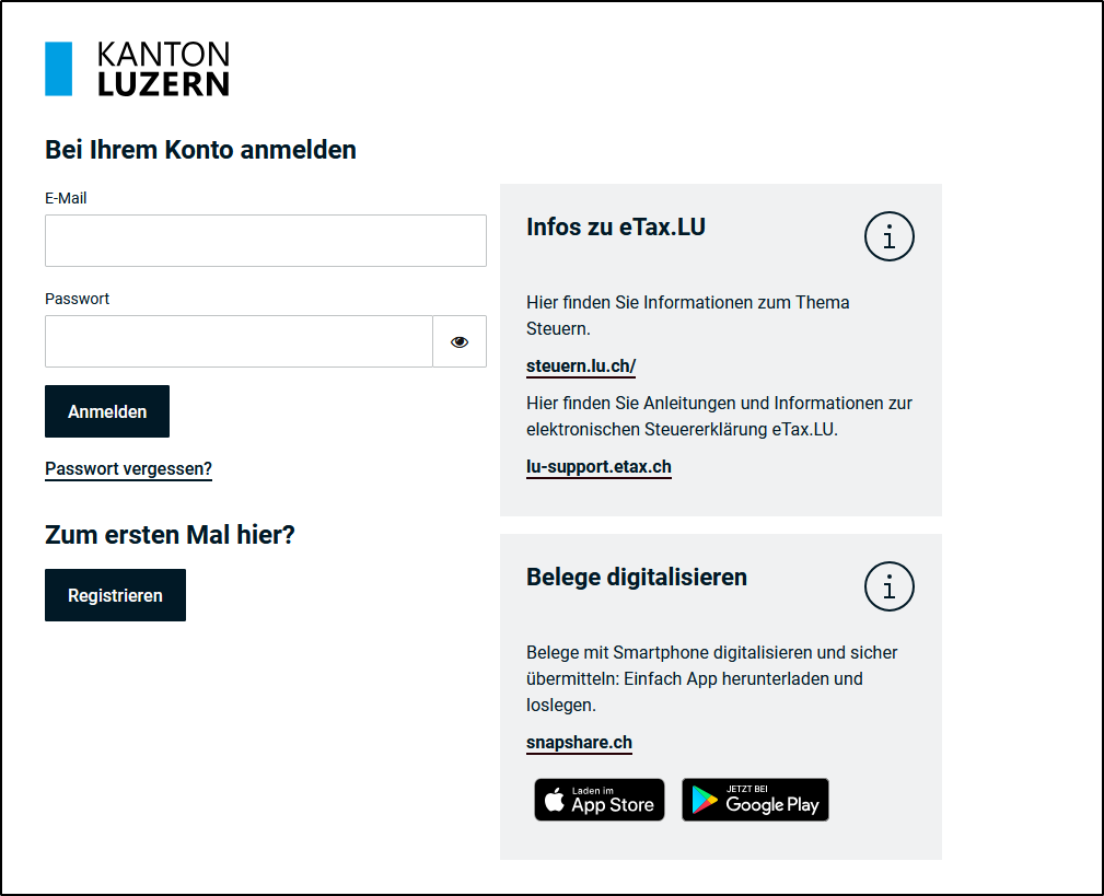 Hinweis: Die Zugangsdaten (PID-Nummer & Zugangscode) finden Sie auf dem Steuererklärungsformular, das Ihnen von der Steuerbehörde Luzern per Post zugestellt wurde.