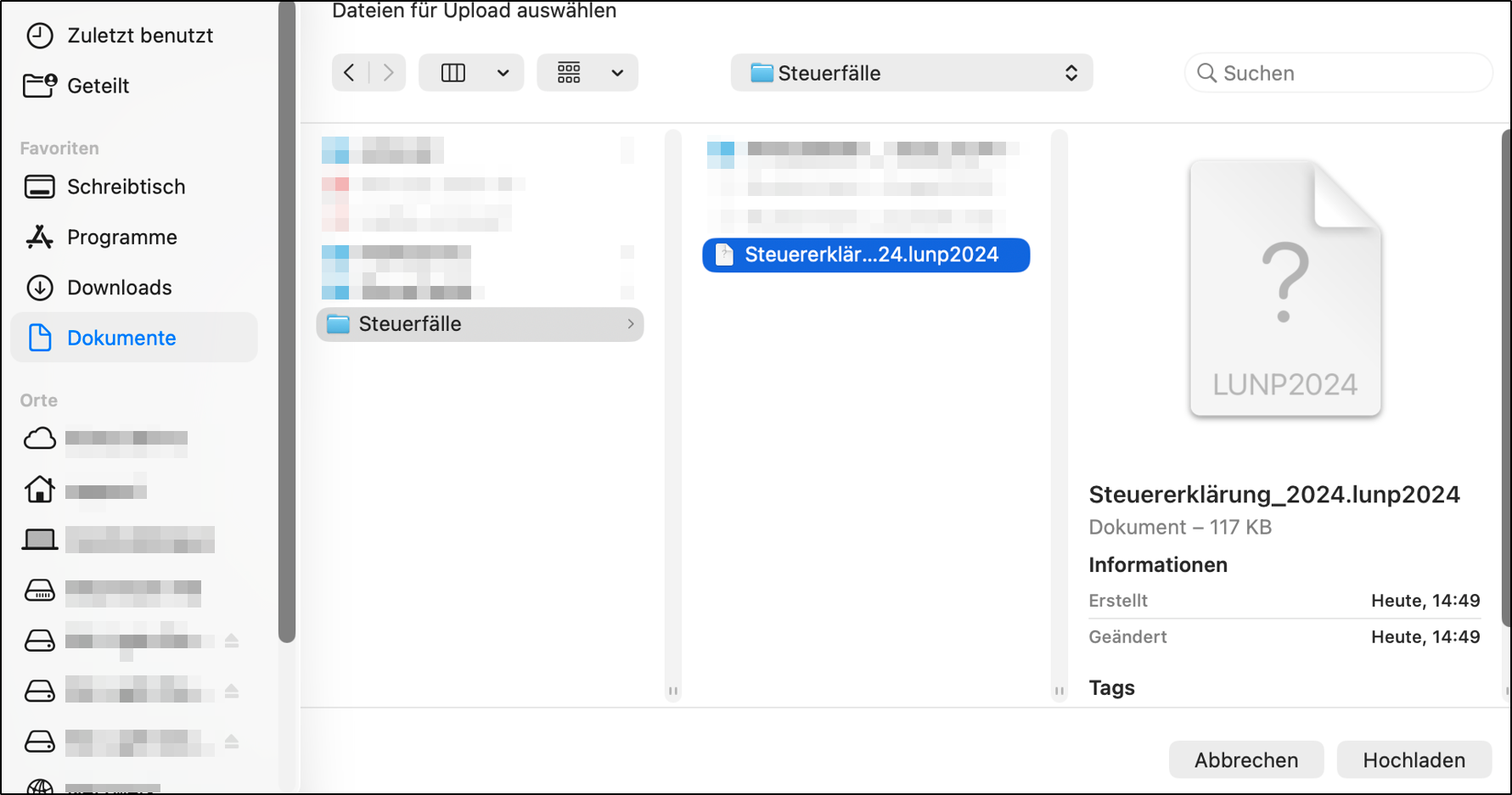 - Navigieren Sie zum Speicherort Ihrer Steuerdatei und wählen Sie die entsprechende Steuererklärung mit der Endung .lunp2024 oder .lujp2024 aus. Wählen Sie anschliessend <Hochladen>.