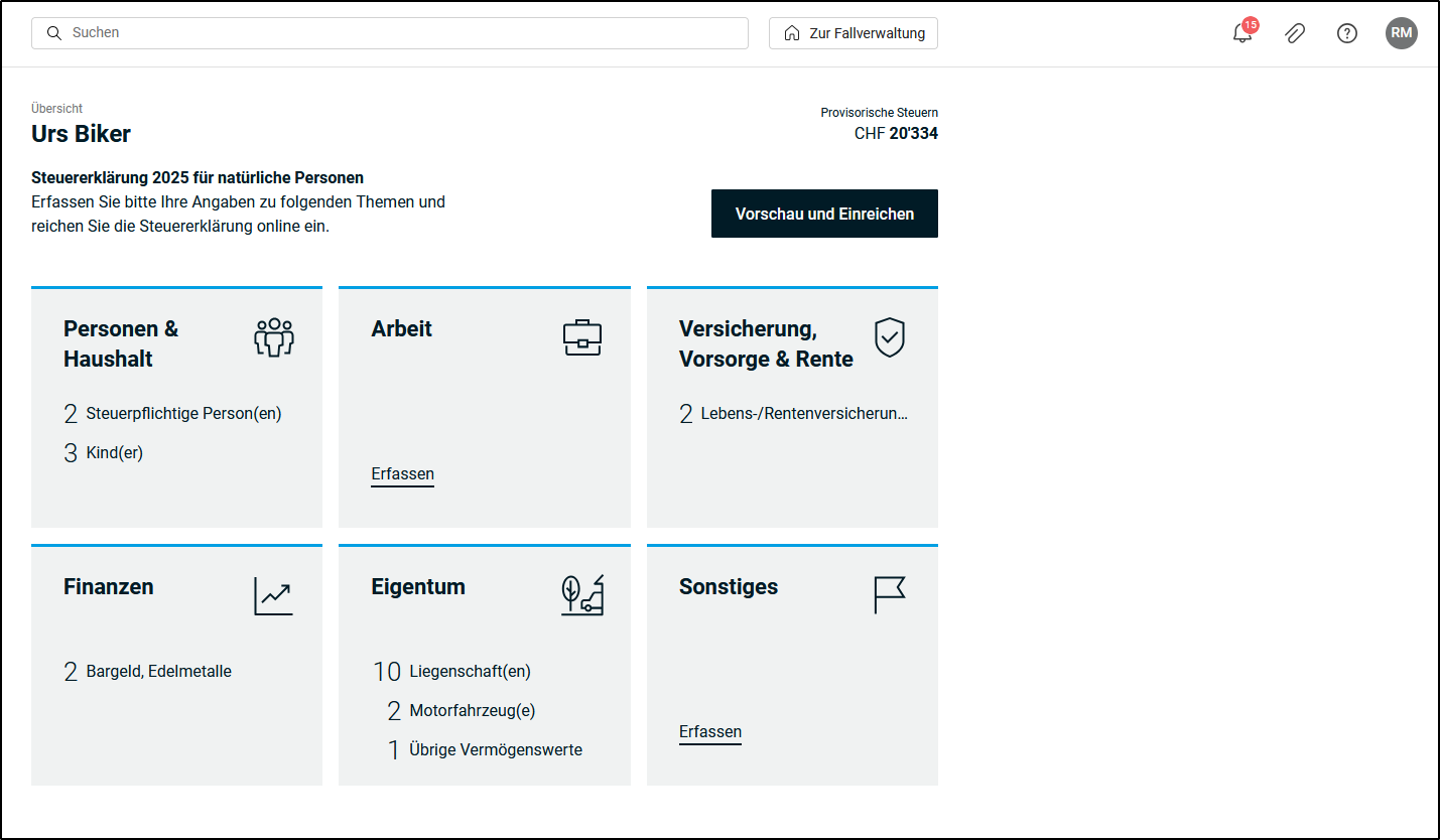 - Die Steuererklärung für 2025 ist nun mit den Vorjahresdaten eröffnet. Sie befinden sich auf der <Übersicht>. Sie können nun mit dem Ausfüllen der Steuererklärung beginnen.