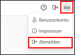 Klicken Sie oben rechts auf Ihre Initialen, um das Benutzermenü zu öffnen. Wählen Sie anschliessend im Dropdown-Menü die Option <Abmelden>.