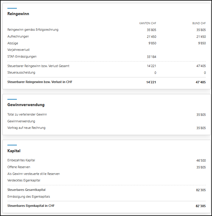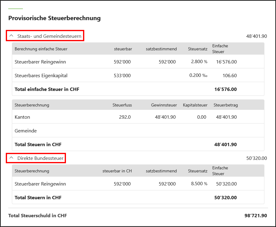 - Am Ende der Seite befindet sich die Karte <Provisorische Steuerberechnung>, mit der Sie die Zusammensetzung der berechneten Steuern im Detail einsehen können. Die Details lassen sich durch Klicken auf die Titel <Staats- und Gemeindesteuern> bzw. <Direkte Bundessteuer> ein- und ausblenden.
