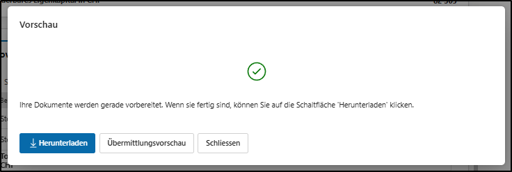 - Durch Klicken auf den Button wird ein neues Fenster geöffnet. Nach einer kurzen Berechnungszeit erscheint der Button <Herunterladen>, über den Sie einen Entwurf der Steuerformulare öffnen können.