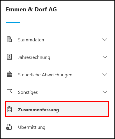 - Wenn Sie sich einen Überblick über die bereits erfassten Daten verschaffen oder die Steuererklärungsformulare in der Vorschau ansehen möchten, können Sie dies über den Menüpunkt <Zusammenfassung> auf der linken Seite tun.