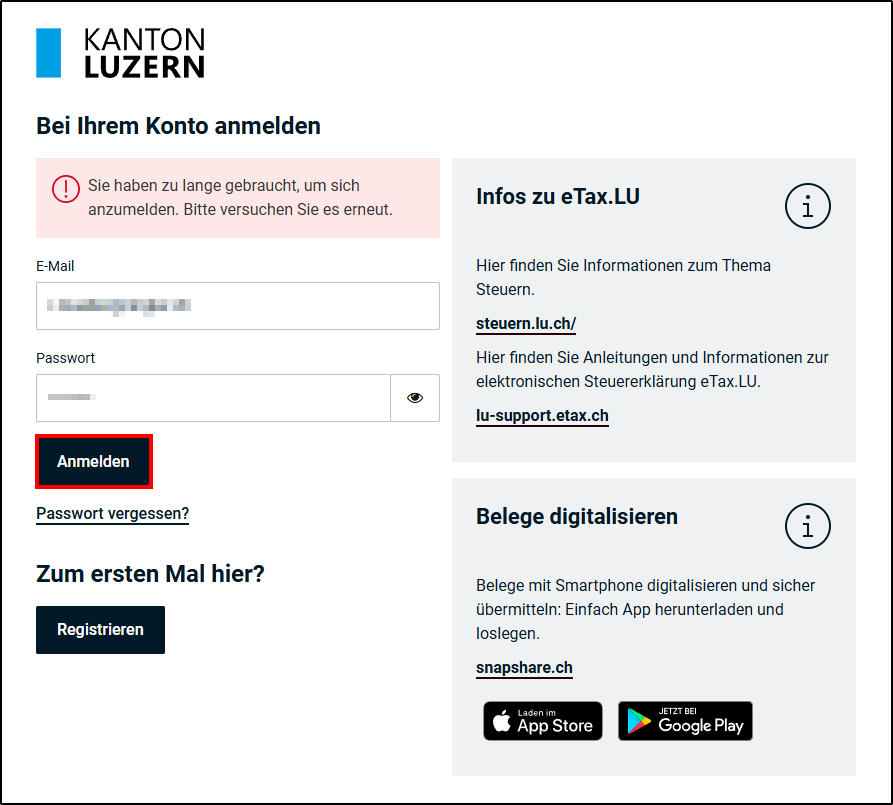 - Melden Sie sich in esteuern.lu.ch mit E-Mail-Adresse und Passwort an.