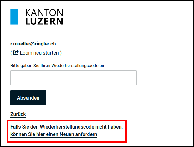 Wählen Sie den Link <Falls Sie den Wiederherstellungscode nicht haben, können Sie hier einen neuen anfordern>.