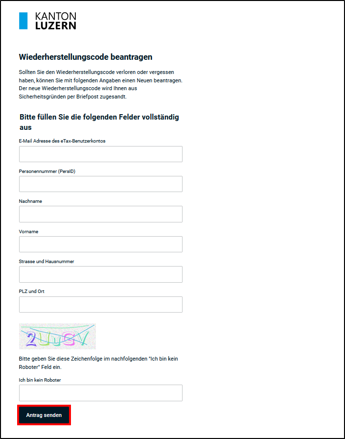 Füllen Sie alle angezeigten Felder vollständig aus, um den Wiederherstellungscode zu beantragen. Klicken Sie anschliessend auf <Antrag senden>.