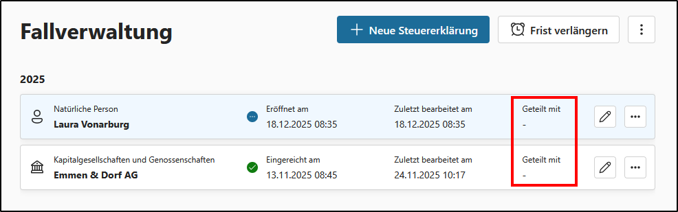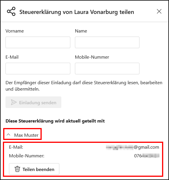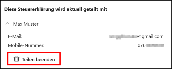 - Es wird die Ansicht zur Verwaltung der Teilung der Steuererklärung angezeigt. Durch Klicken auf den Pfeil unterhalb von „Diese Steuererklärung wird aktuell geteilt mit“ werden die Kontaktdaten des Empfängers eingeblendet.