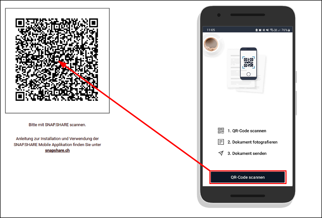 - Öffnen Sie auf Ihrem Smartphone die Snap.Share-App. Wählen Sie <QR-Code scannen> und fotografieren Sie den angezeigten QR-Code. Tippen Sie anschliessend in der App auf <Dokument fotografieren>.