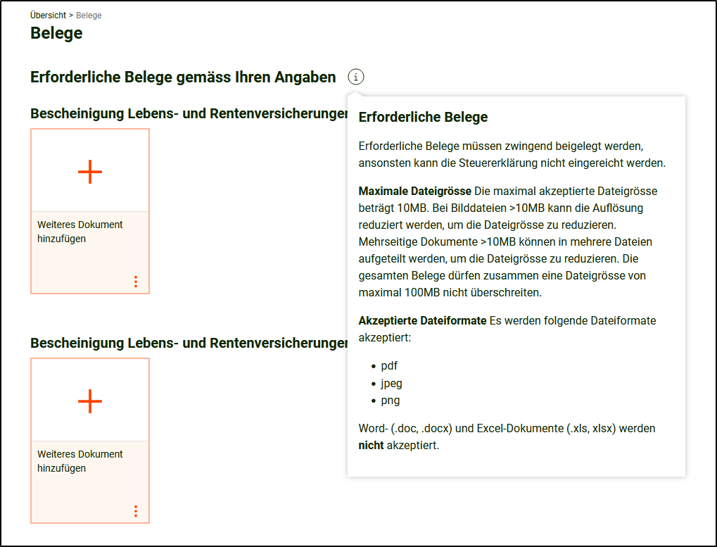Es können insgesamt maximal 50 Belege eingereicht werden. Die gesamten Belege dürfen zusammen eine Dateigrösse von maximal 100MB nicht überschreiten.